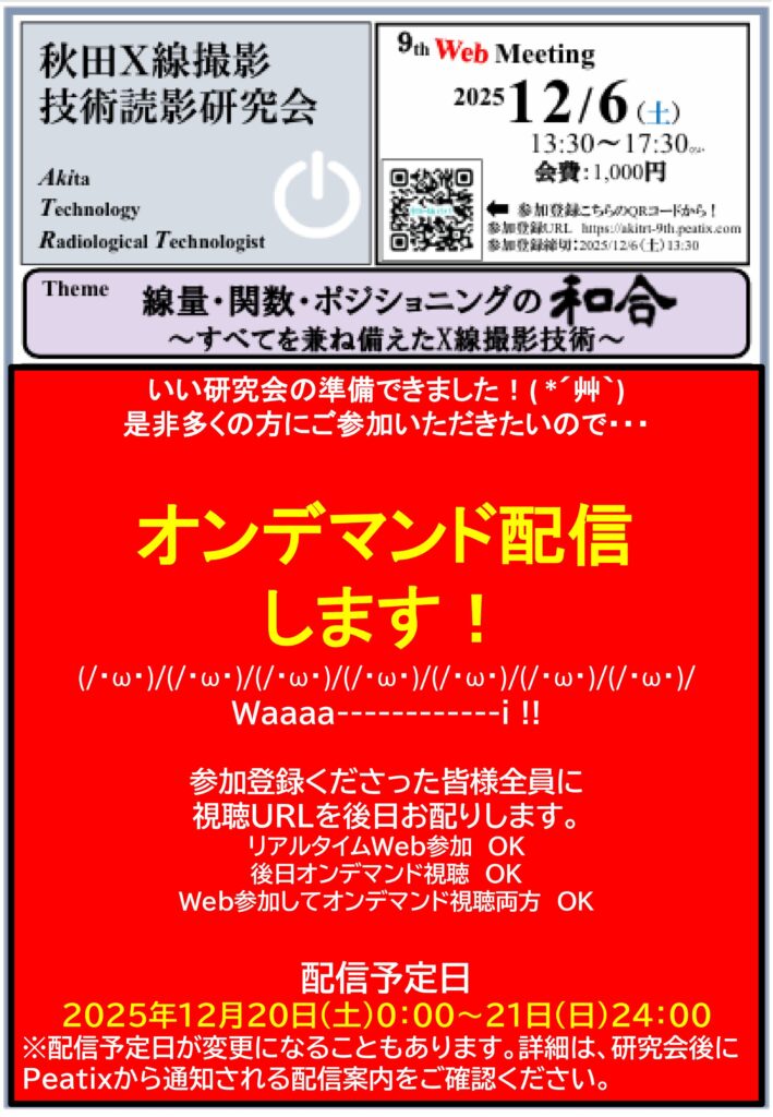 以下の開催のお知らせをいたします。 項目詳細事業名称(開催イベント名)第9回 秋田X線撮影技術読影研究会Web Meeting主催者(研究会名)秋田X線撮影技術読影研究会開催日2025.12.6(土)開催時間13:30-17:30開催場所Web(後日オンデマンド配信あり)参加費用会費 1000円問い合わせ先(担当者)工藤 和也問い合わせ先(メールアドレス)ac911046@akita-city-hospital.jp事業内容・趣旨等テーマ 線量・関数・ポジショニングの和合~~すべてを兼ね備えたX線撮影技術~ *上記詳細は依頼フォームの記載内容を反映しています。 申し込みはこちらから 最新の投稿 2025年12月18日研修会・セミナー令和7年度マネジメント研修会2025年12月3日研修会・セミナーJFRT第21回定例勉強会WEB2025年11月23日お知らせ県北しんぶん 2025(No.2) 掲載2025年11月13日研修会・セミナー第9回 秋田X線撮影技術読影研究会 Web Meeting2025年11月5日研修会・セミナーJFRT第20回定例勉強会WEB2025年11月5日研修会・セミナー第10回 秋田血管撮影技術研究会 ATAC