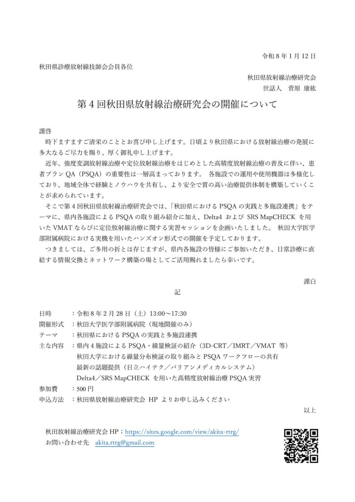 | 事業内容・趣旨等 | 秋田県内でも放射線治療機器の更新が進み、高精度放射線治療を提供できる環境が整ってきました。しかしながら、各施設での運用や使用機器は多様化しており、地域全体で経験とノウハウを共有する必要があると考えております。 そこで、令和8年2月28日に秋田大学医学部附属病院にて第4回秋田県放射線治療研究会を企画いたしました。 秋田県診療放射線技師会員の皆様に周知いただき、経験の有無を問わず、気軽に参加を賜りたいと思っております。 |